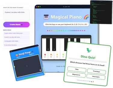 With Tinycapes AI, kids don’t just play games, they create their own mini-games using simple ideas like a piano they can play with clicks or a fun quiz about dinosaurs.