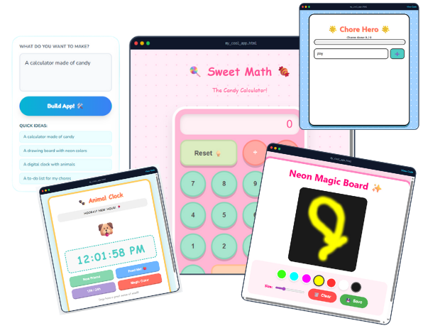 With Tinycapes AI, kids create useful everyday apps like calculators, clocks, drawing boards, and to-do lists using ideas instead of code.